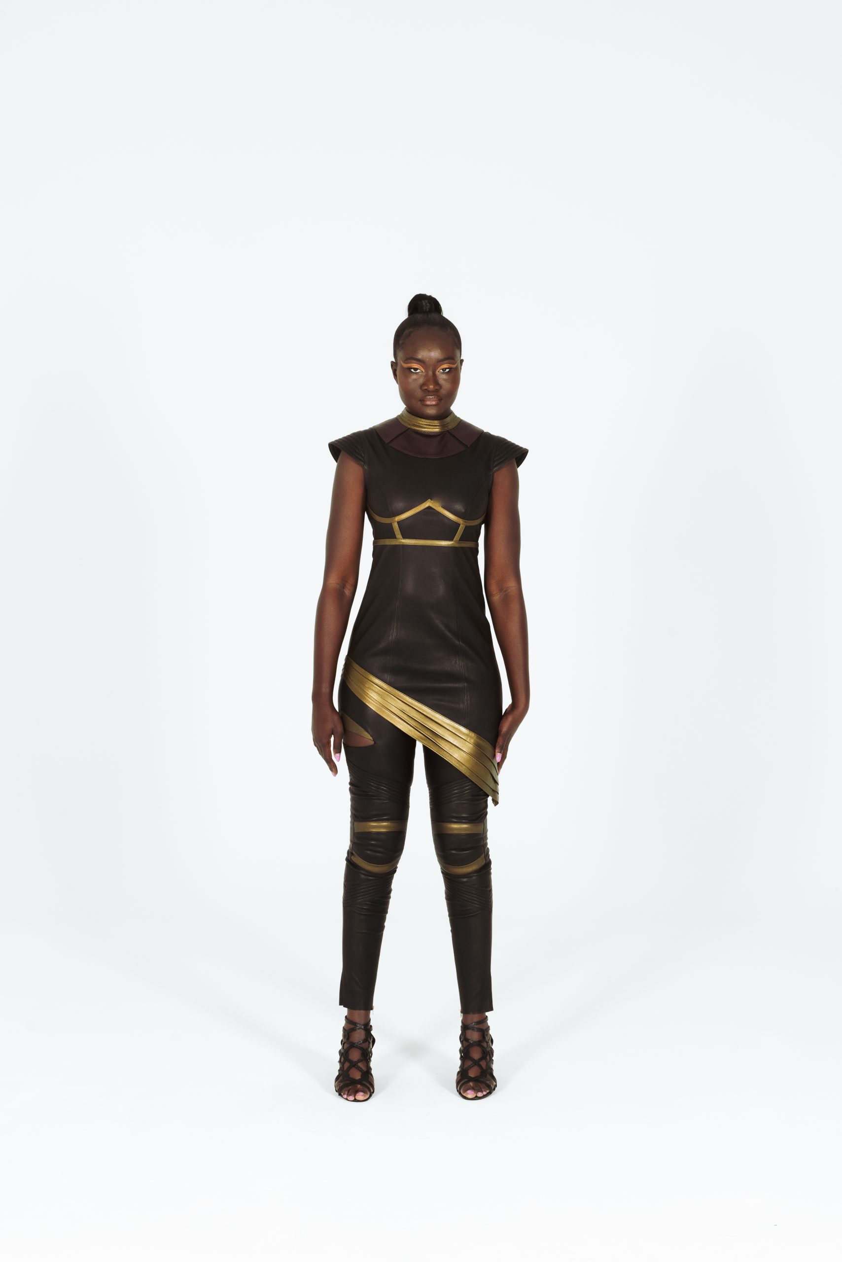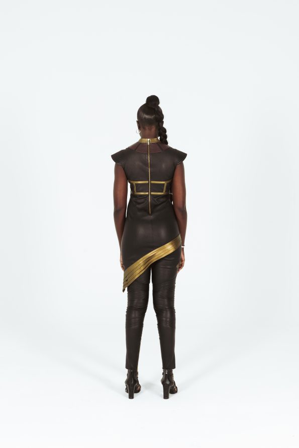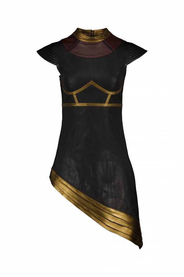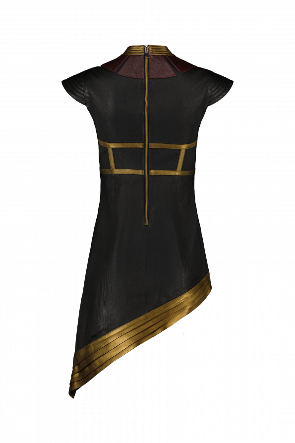 La forme asymétrique et la découpe audacieuse évoquent le pouvoir de Wonder Woman tandis que le charme du cuir ajoute une touche de luxe à l’ensemble.