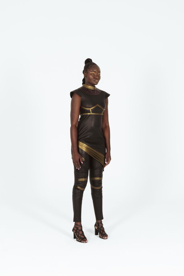 Dotée d’une coupe asymétrique, elle incarne la grâce qui évoque immédiatement l’aura majestueuse de la reine du Wakanda.