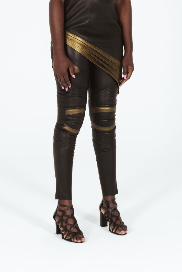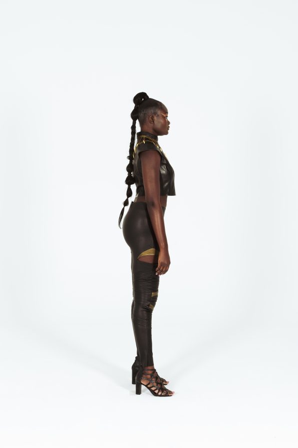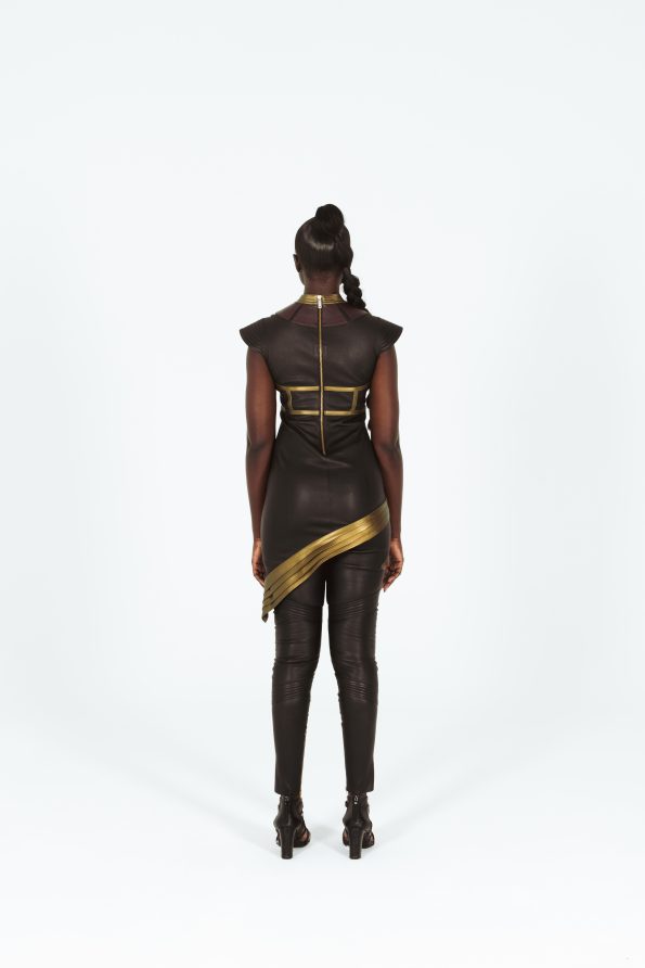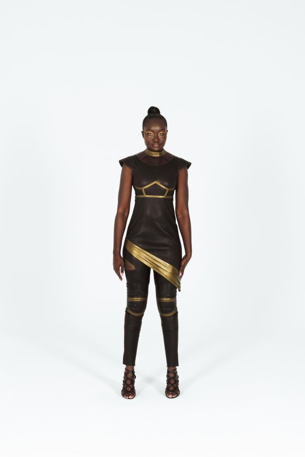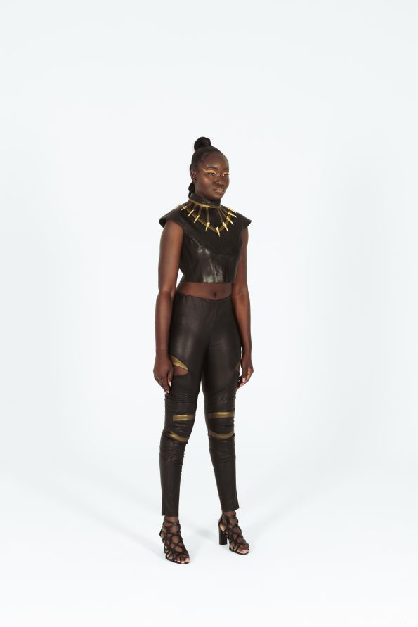 Les fentes latérales ornées de bords dorés ajoutent une touche de sophistication et de panache, tout en évoquant l’armure des guerrières du Wakanda.