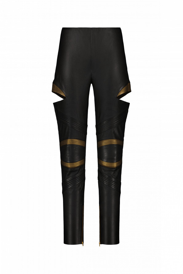 - Fentes latérales ouvertes aux cuisses avec bord doré métallisé